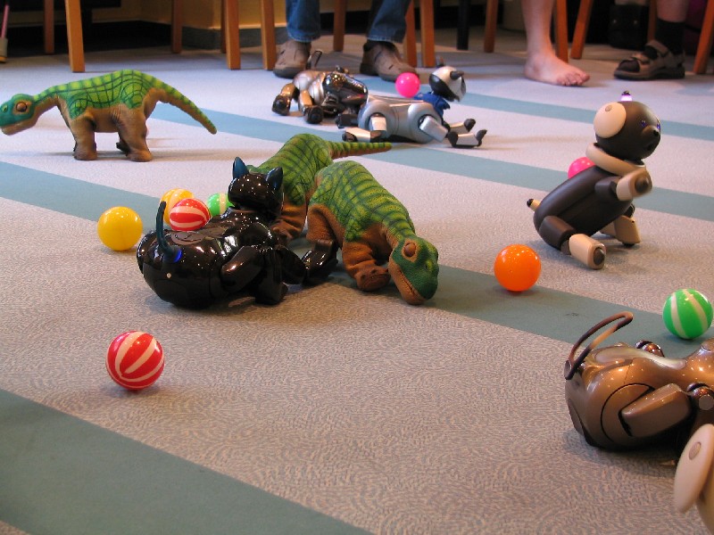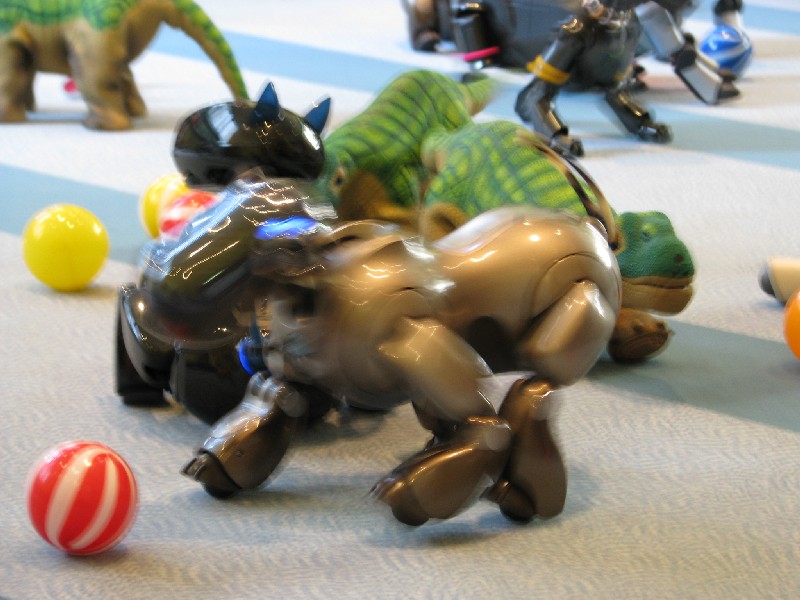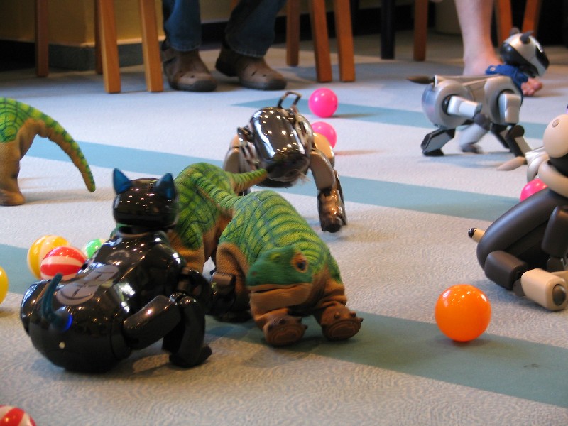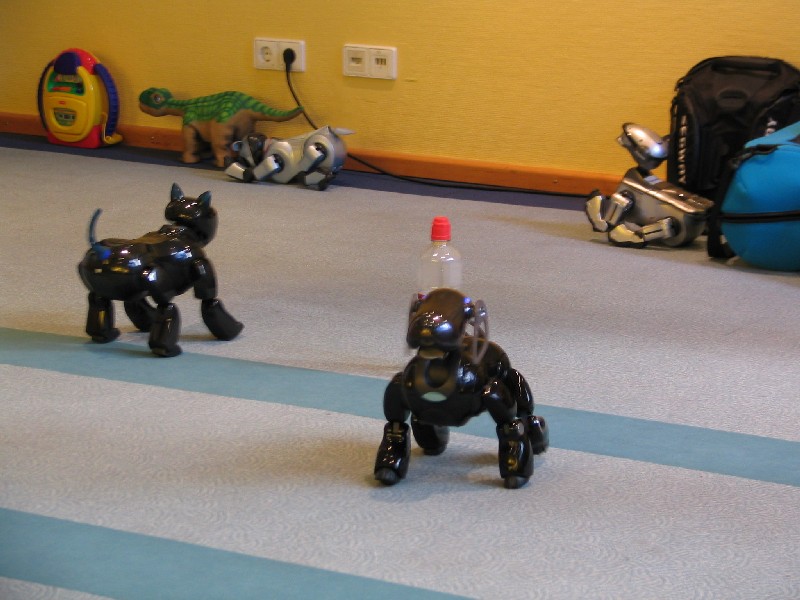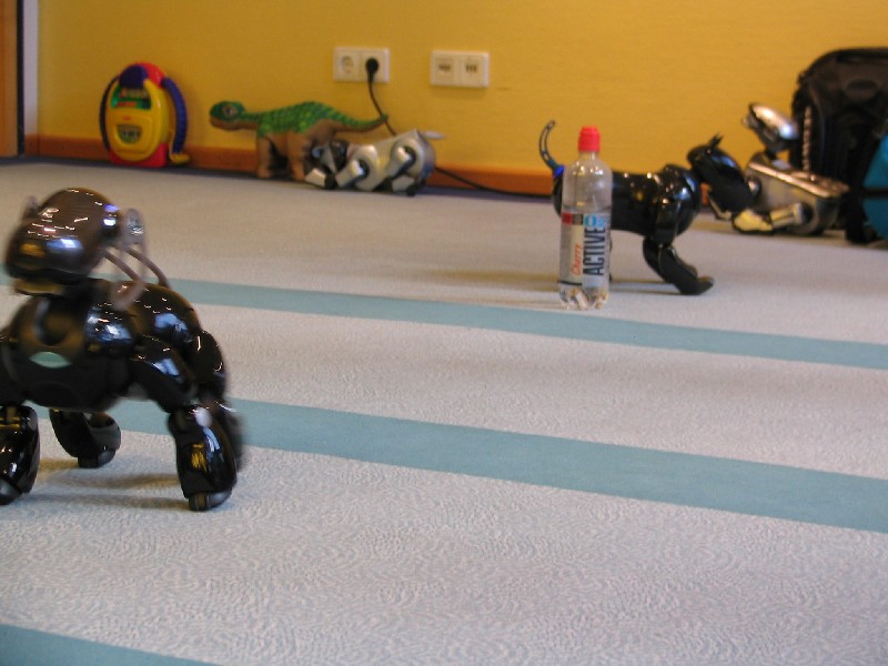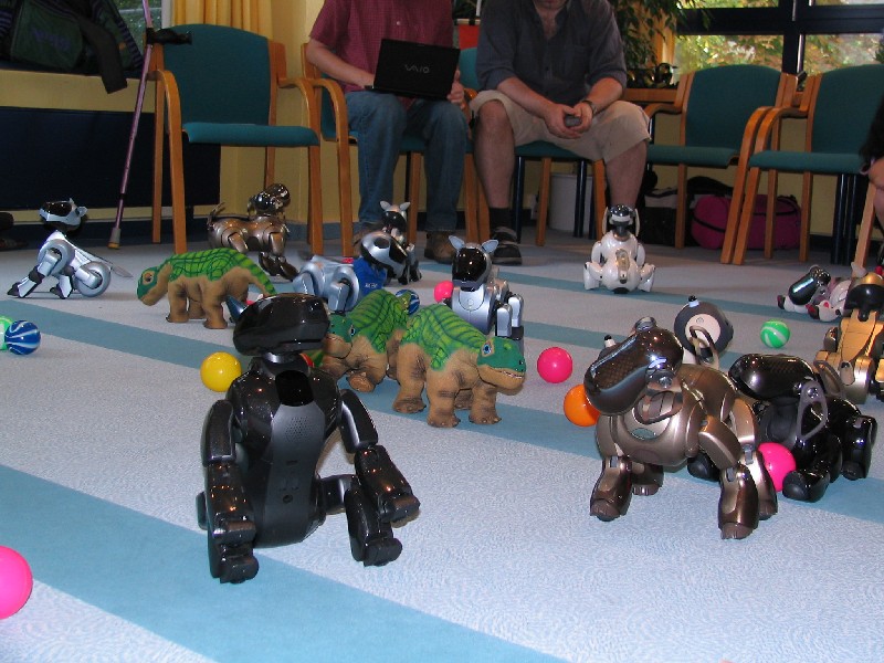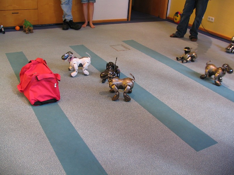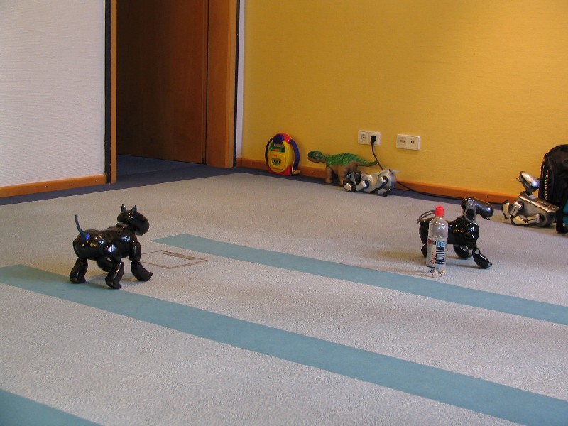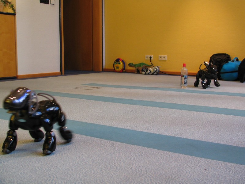 Ein Pleo hat sich einfach mit rein-gemogelt. Er wird aber chancenlos sein. Der hat auch keinen "rosa Ball" - er wird doch wohl nicht versuchen, einen der Aibos seinen Ball abzujagen?