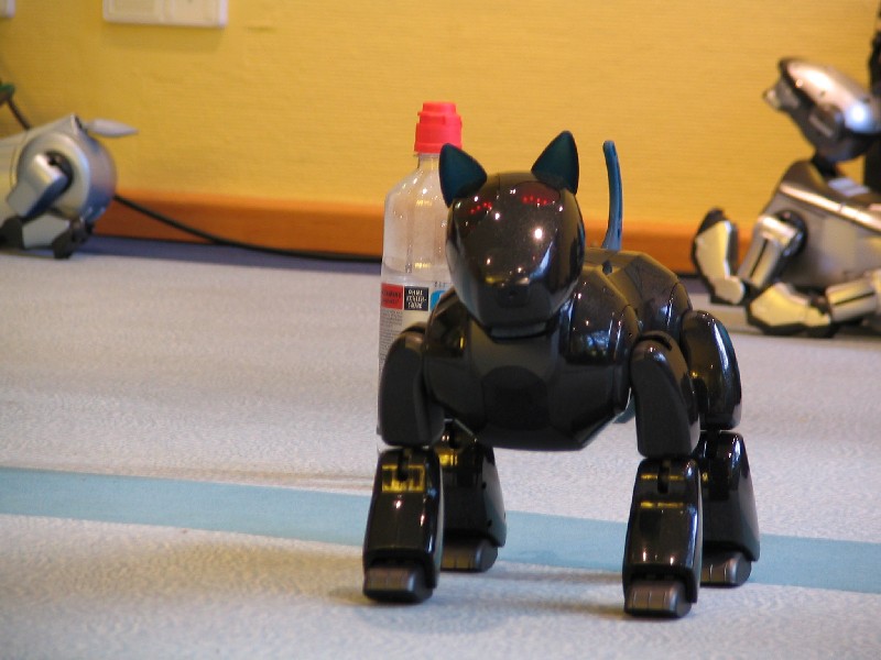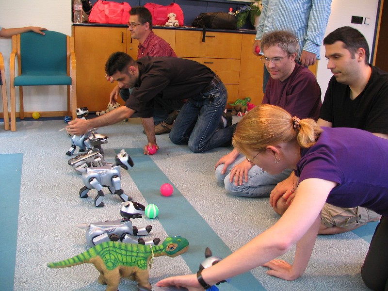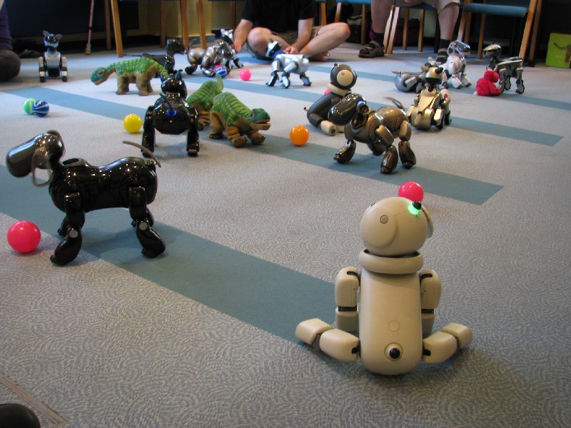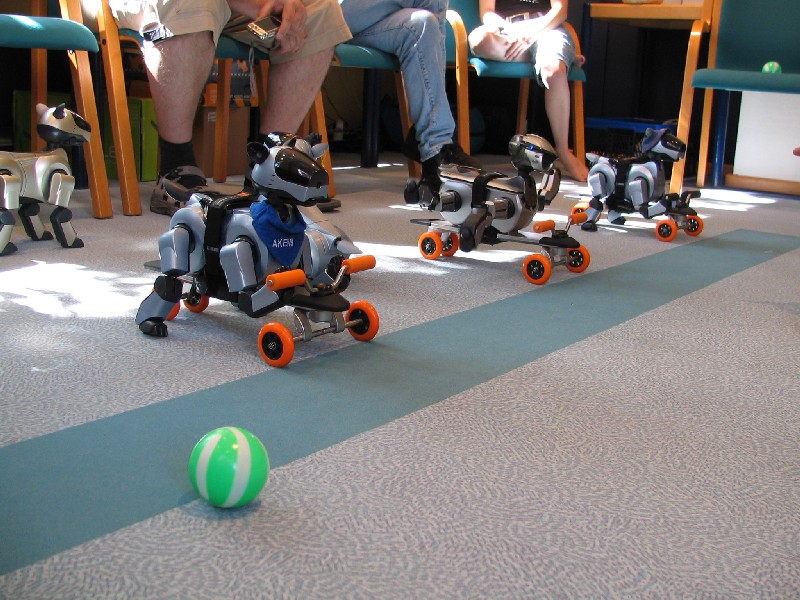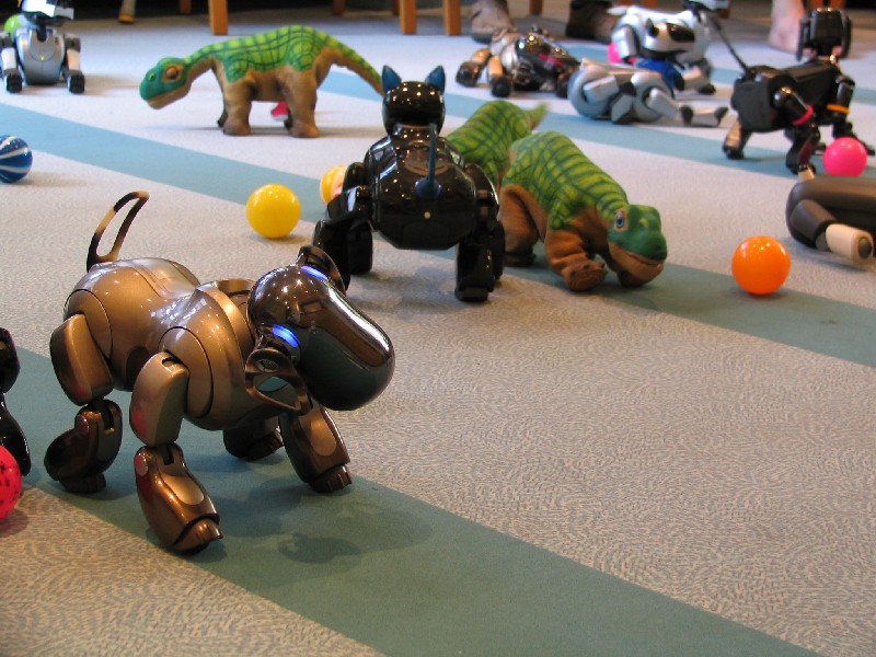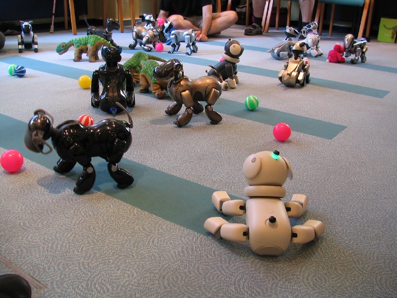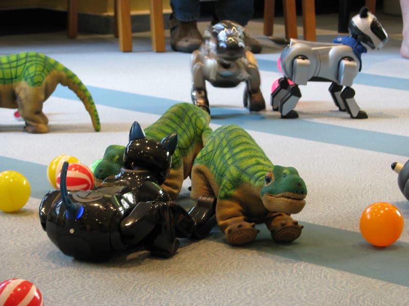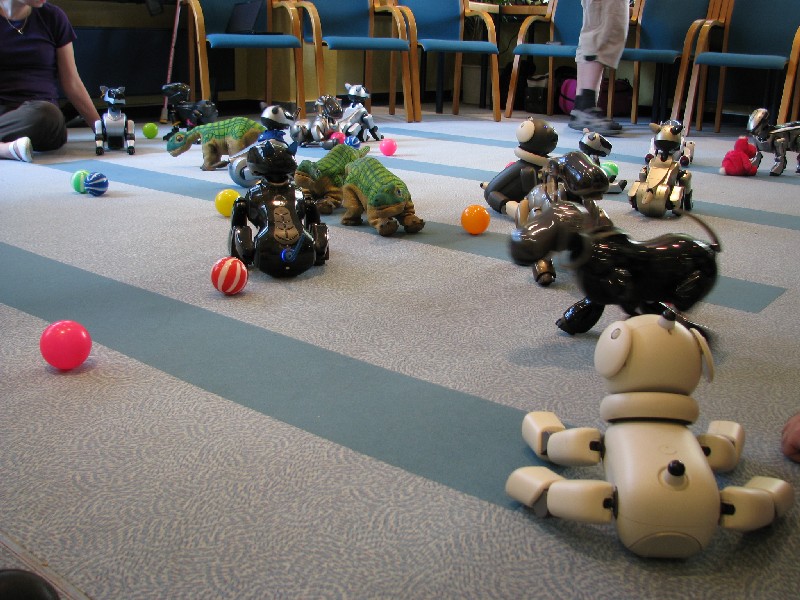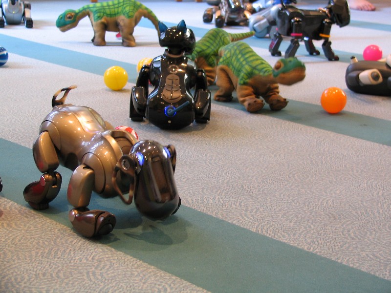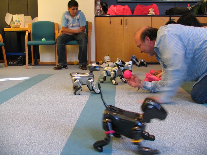 Ein Pleo hat sich einfach mit rein-gemogelt. Er wird aber chancenlos sein. Der hat auch keinen "rosa Ball" - er wird doch wohl nicht versuchen, einen der Aibos seinen Ball abzujagen?