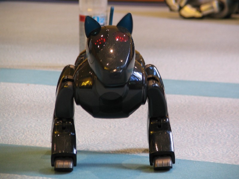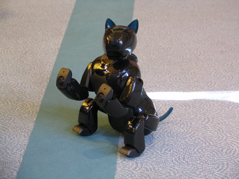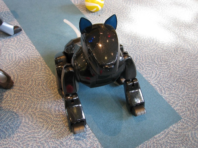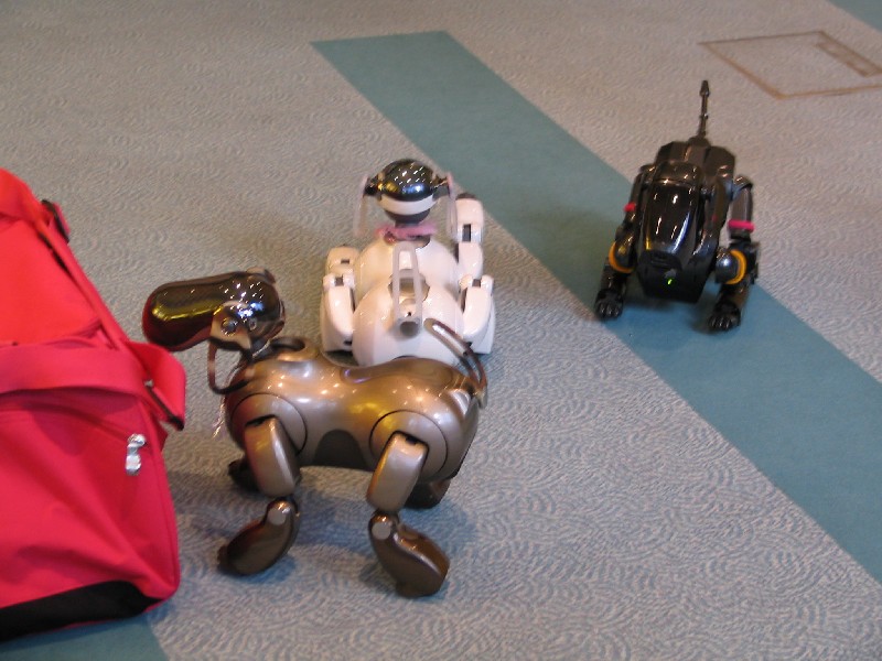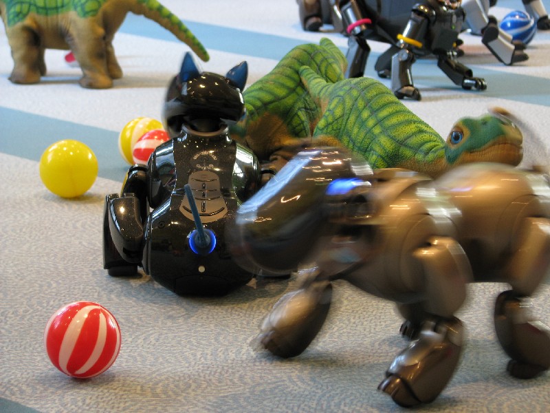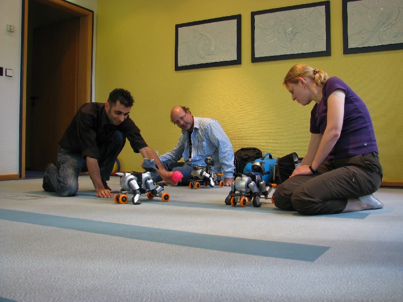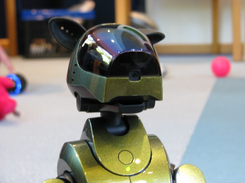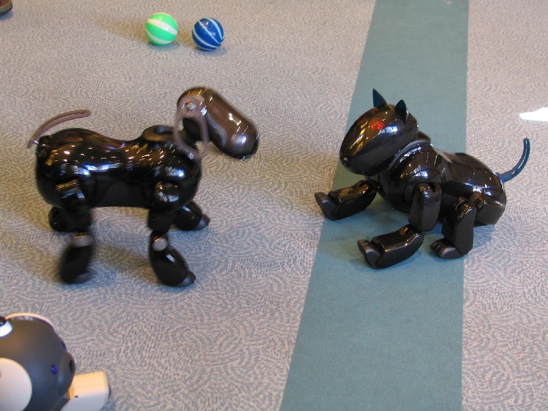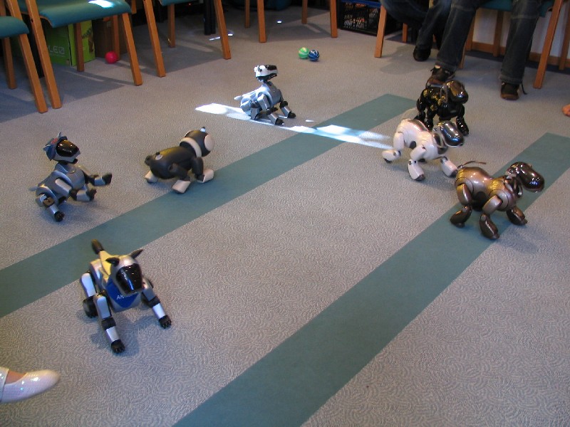 Ein Pleo hat sich einfach mit rein-gemogelt. Er wird aber chancenlos sein. Der hat auch keinen "rosa Ball" - er wird doch wohl nicht versuchen, einen der Aibos seinen Ball abzujagen?