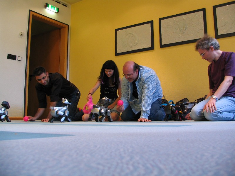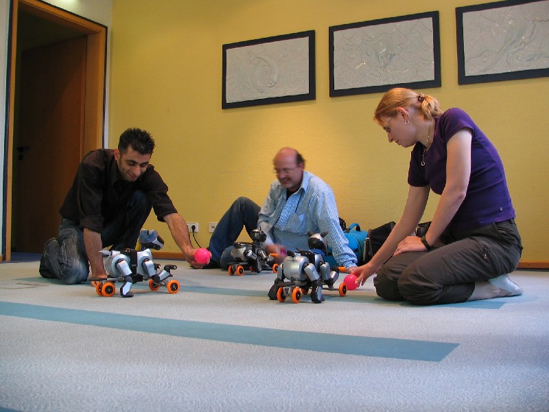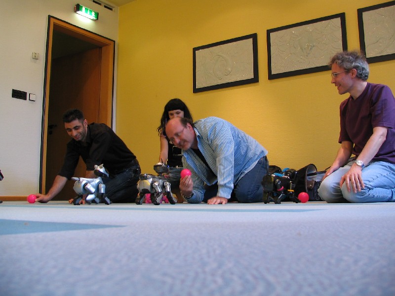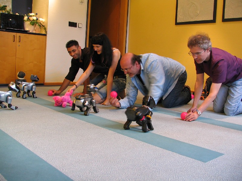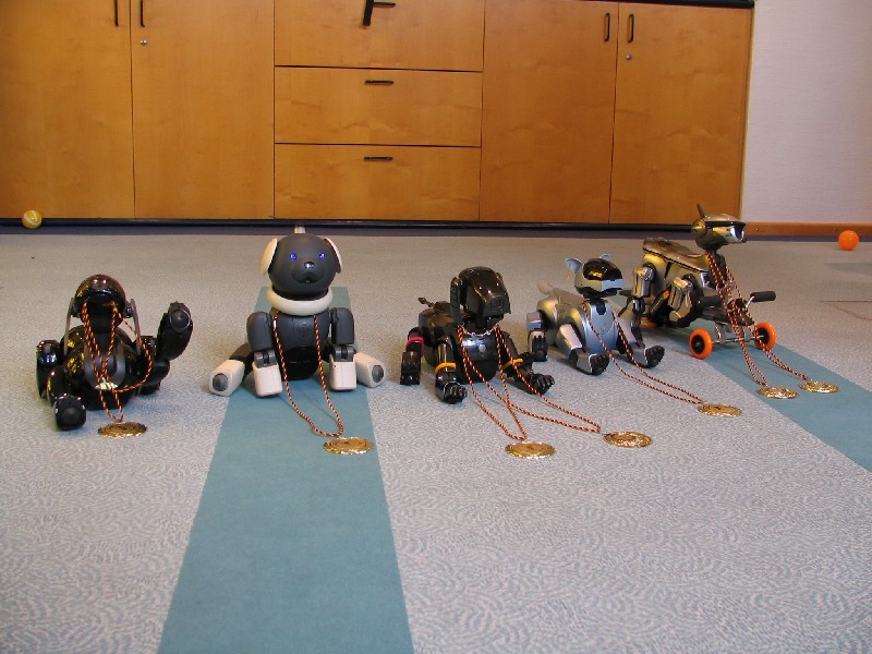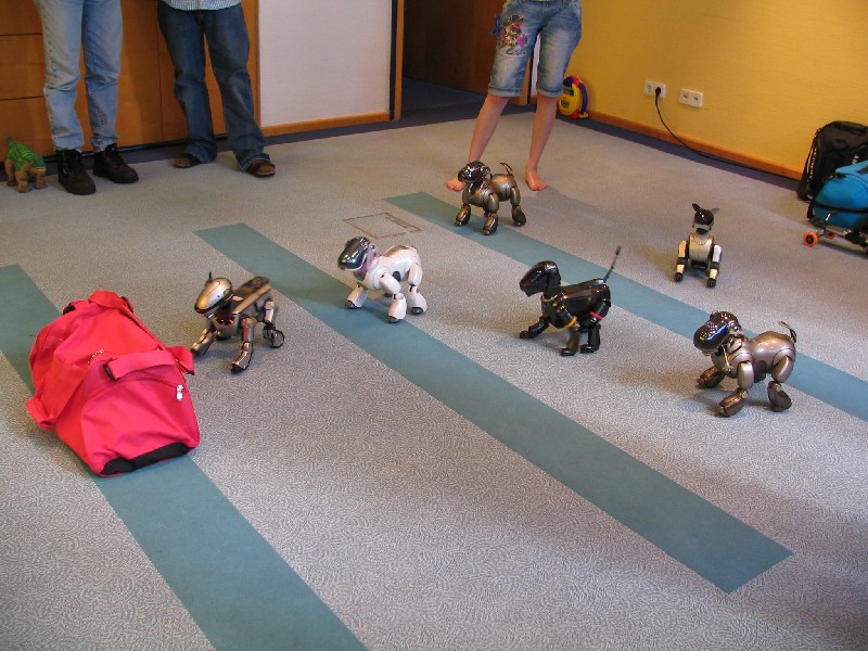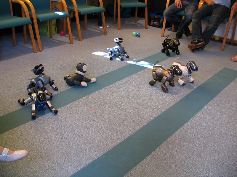 Alle Aibos dürfen teilnehmen und stellen sich in gleicher Entfernung