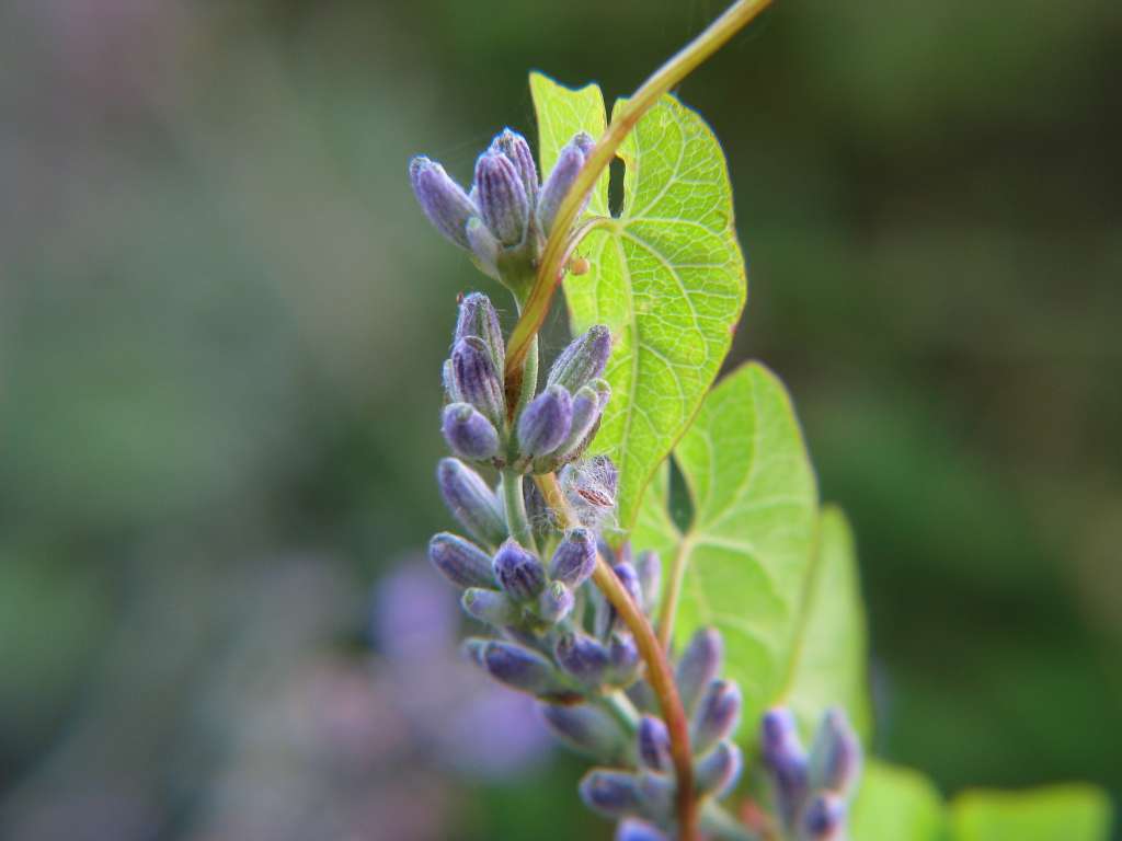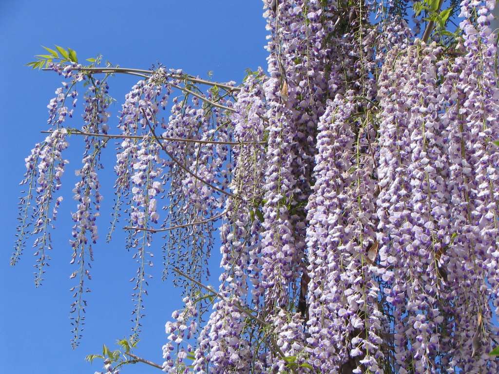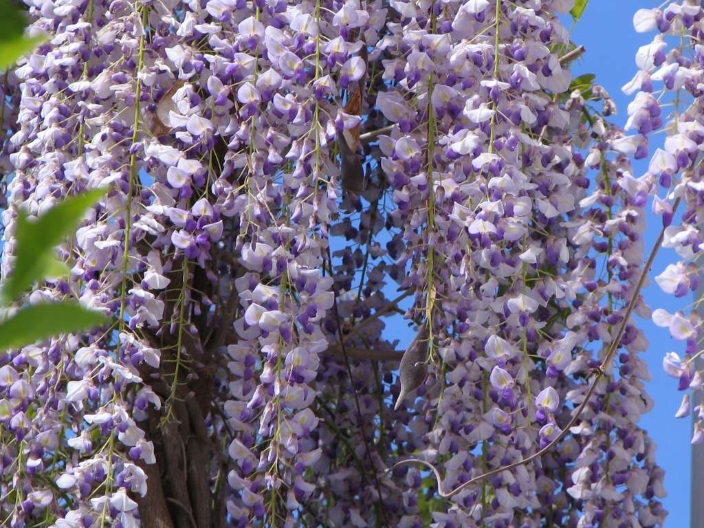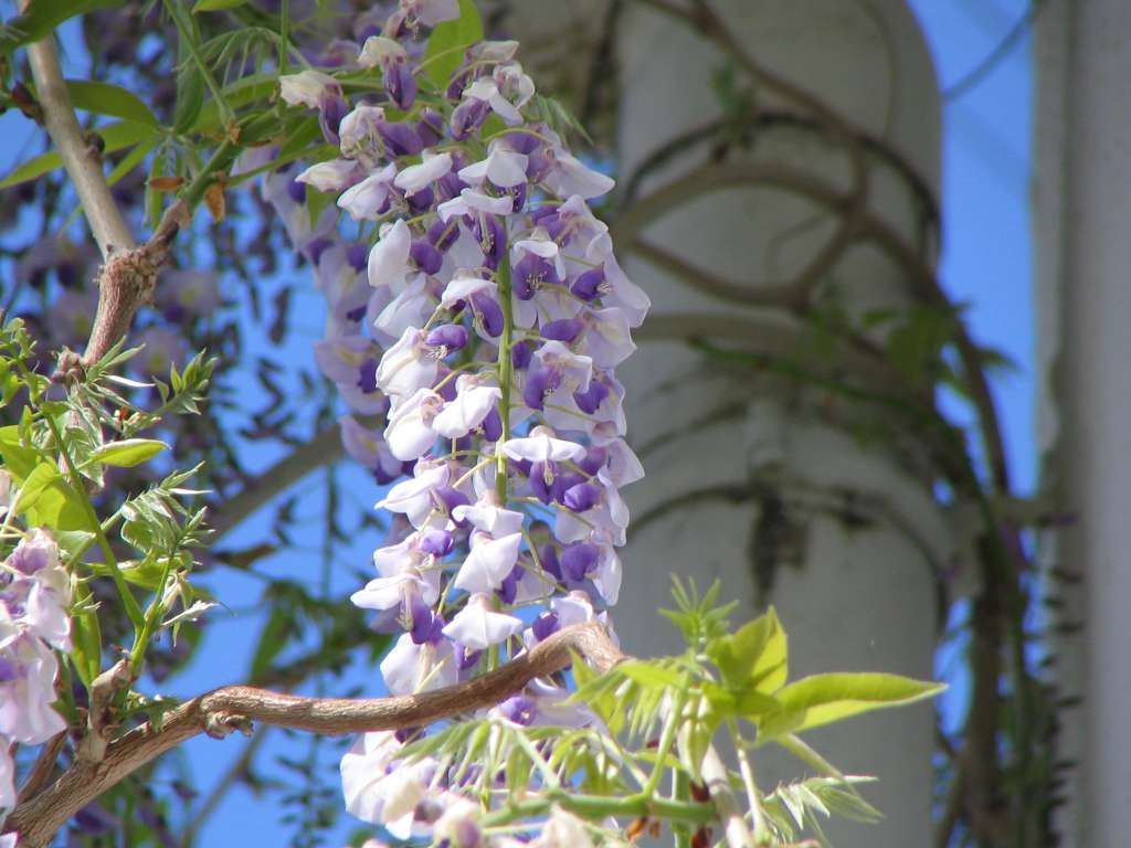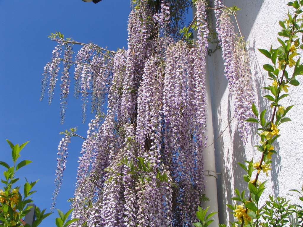 Der Blauregen wächst sehr hoch bis unter das Dach.