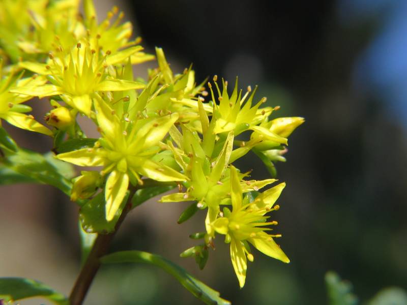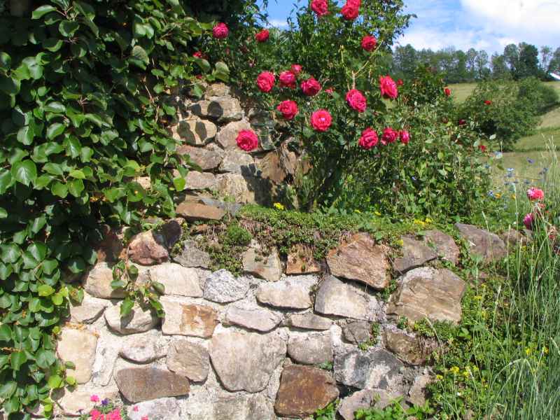 Der Rosenwurz ist in der Bildmitte, unter den Rosen