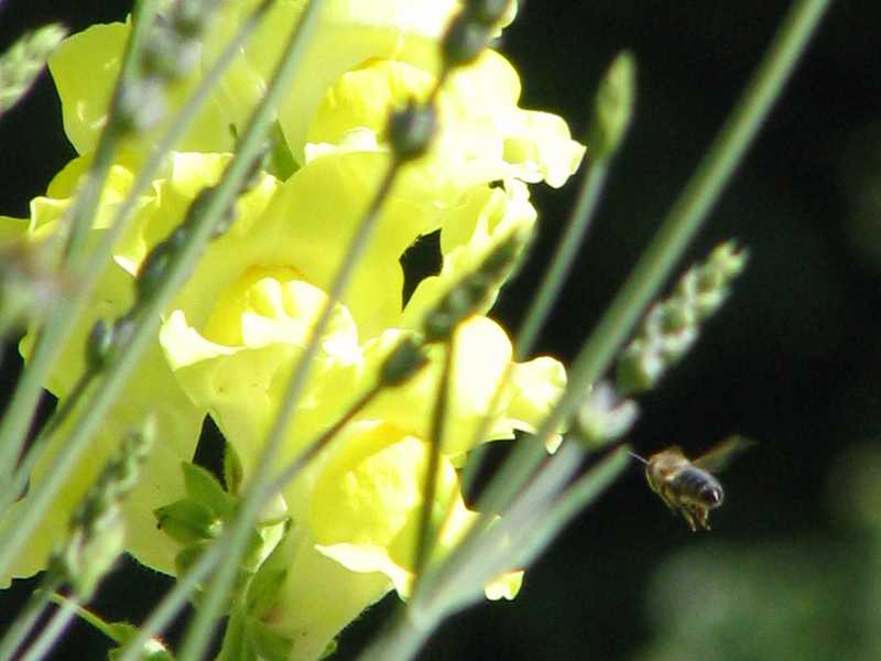 Wer etwas genauer hin schaut, kann die kleine, anfliegende Biene
